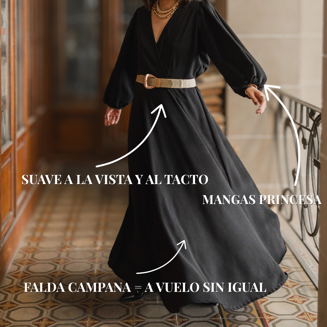 El corte cruzado estiliza, las mangas largas estilo princesa suman elegancia, y la falda amplia acompaña cada paso con gracia.
